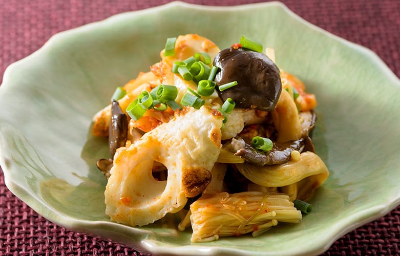 - 白菜キムチを加えてひと混ぜし、器に盛る。細ネギを散らし、お好みでしょうゆをたらす。